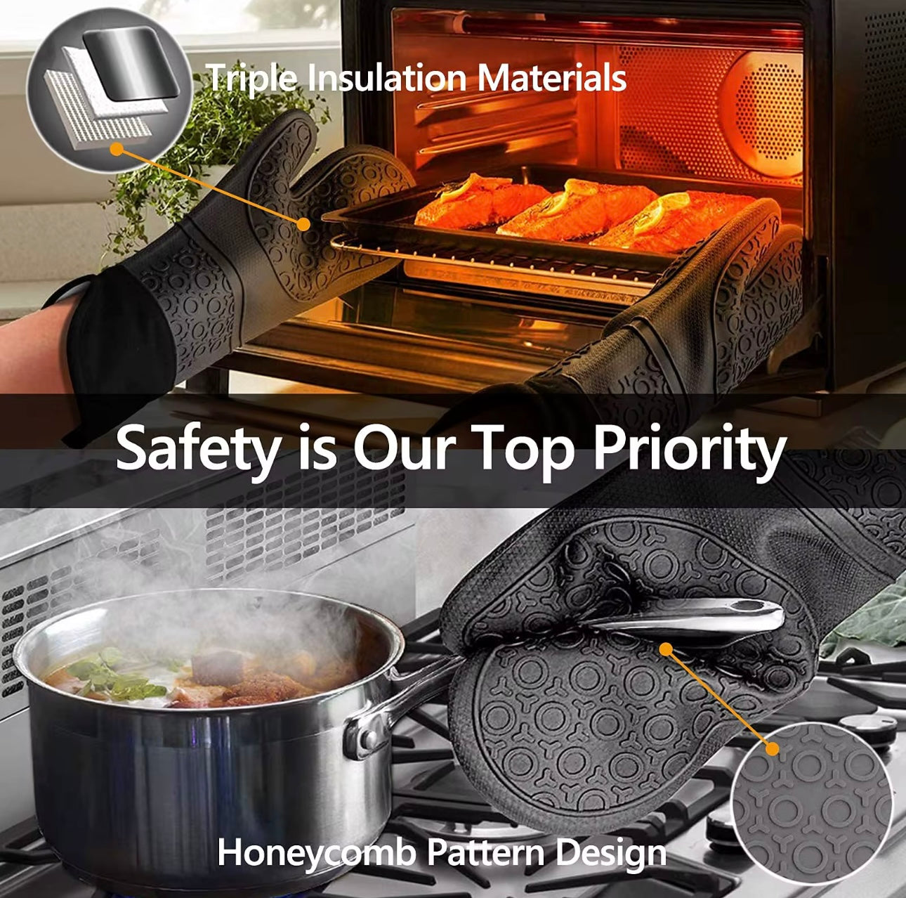 Heat Resistance - The oven mitts offer maximum protection, shielding against temperatures as high as 500 degrees. Comfortable and Flexible - Perfect choice for while using a grill, griddle, stovetop, or baking food in ovens. Non-Slip Grip - Made of durable silicone; slip-resistant which helps you achieve an optimal grip when cooking. The unique pattern allows you to hold flat pans, pots, and baking dishes.