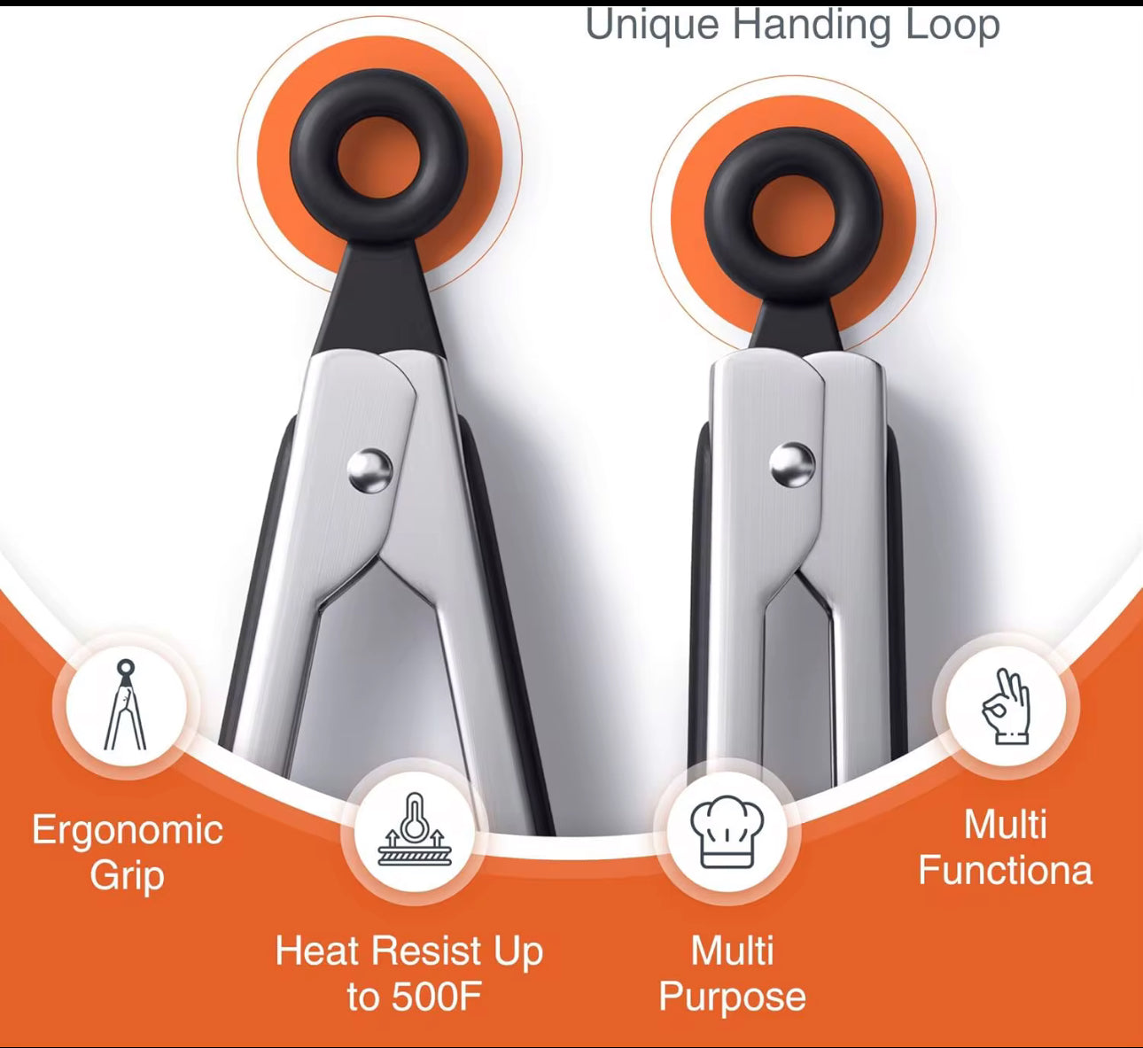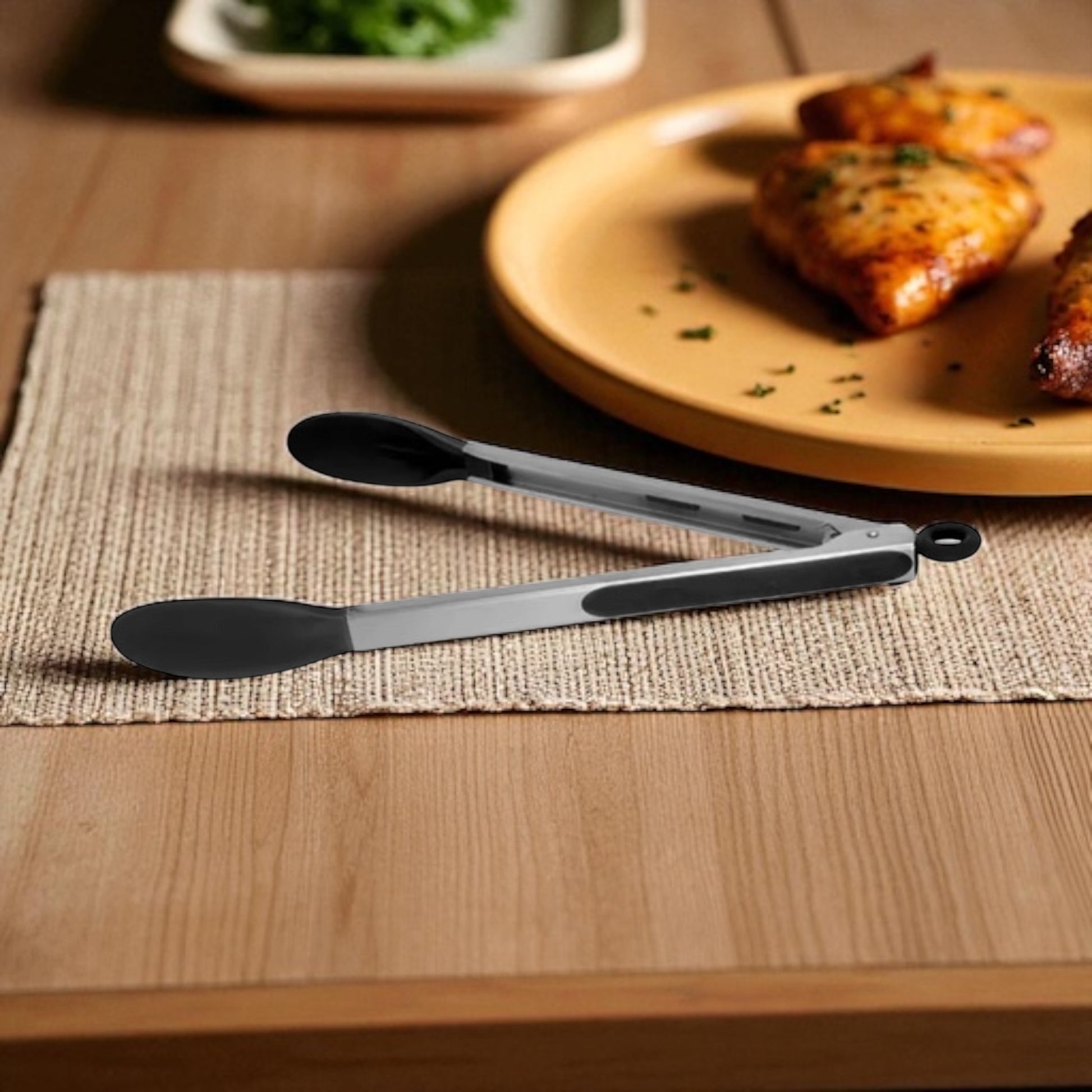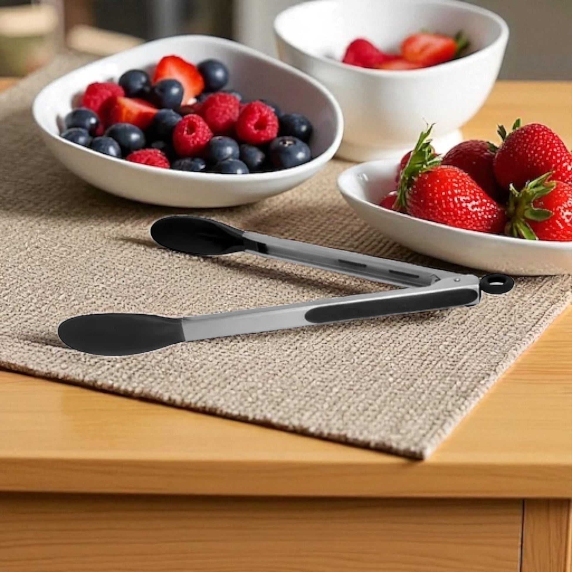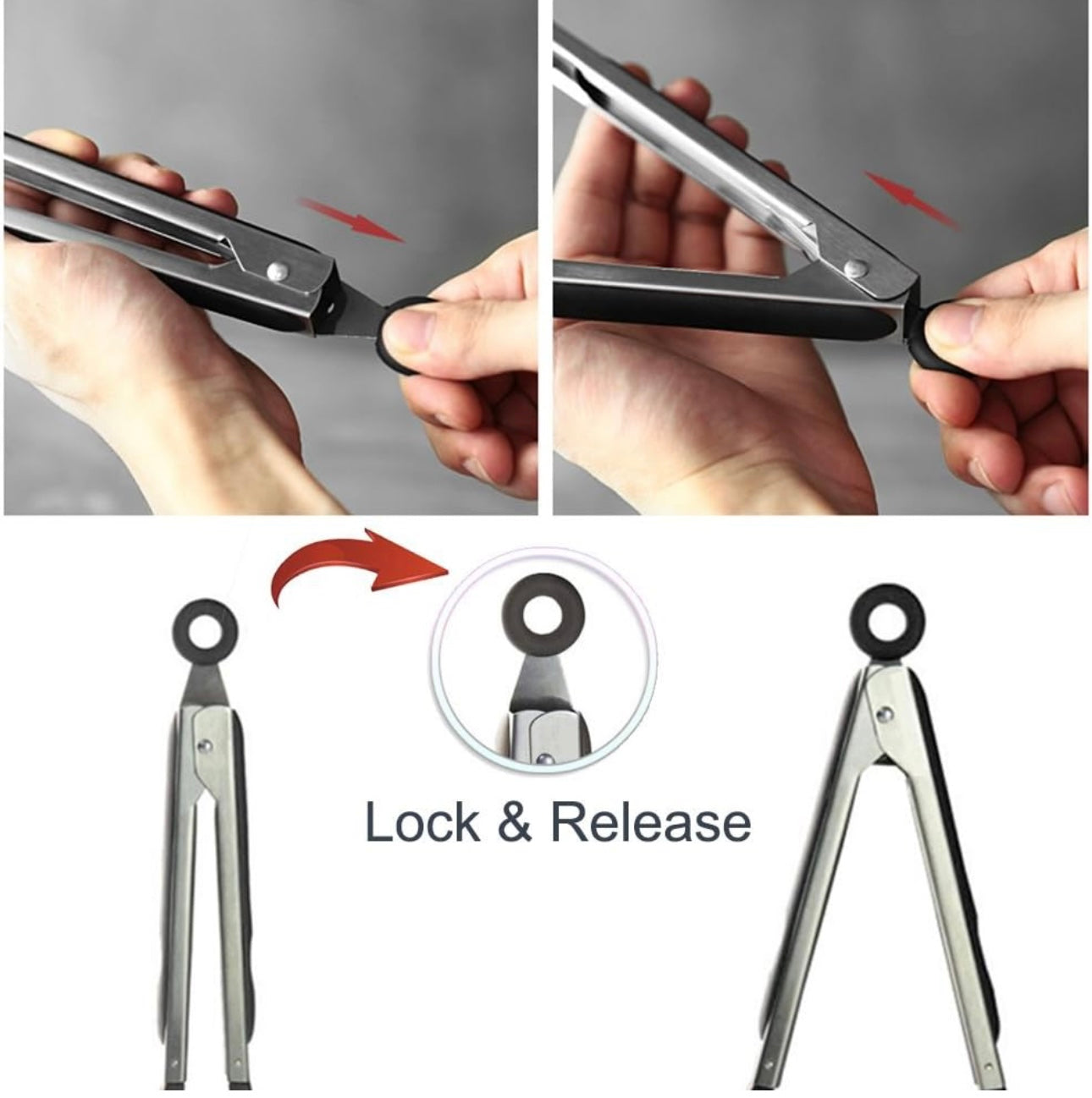 Shaws Cookware regular tongs and spatula tongs is great for serving dinner at home & buffets, taco bar, appetizers, grilling corn, burgers, hot dogs, serving salad, & many more. Both styles have a locking mechanism. Pull the ring to lock and push it to unlock, which is extremely easy to operate. Hang them with the hanging loop after use or put them in the drawer by pulling the ring to lock them. Perfect for kitchen use, indoor or outdoor use. Set of 4 includes one each: 12" Black Tong, 12" Black Spatula Tong, 10" Black Tong, 10" Black Spatula Tong.